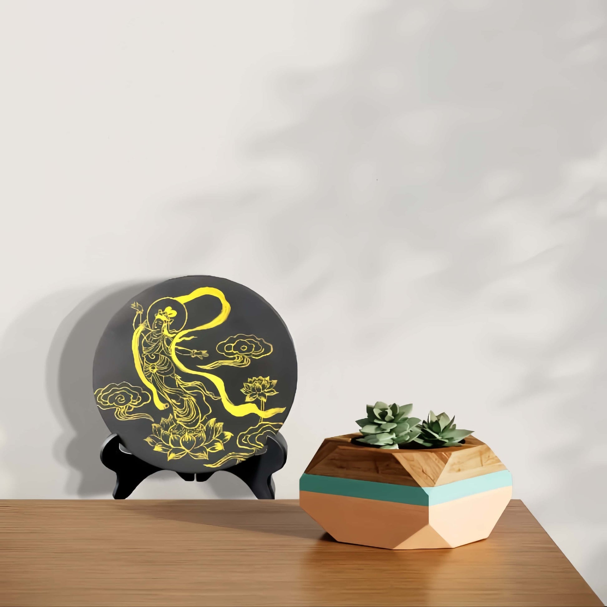 Handpainted Gold Line Apsara Art | Black Wood Buddhist Decor