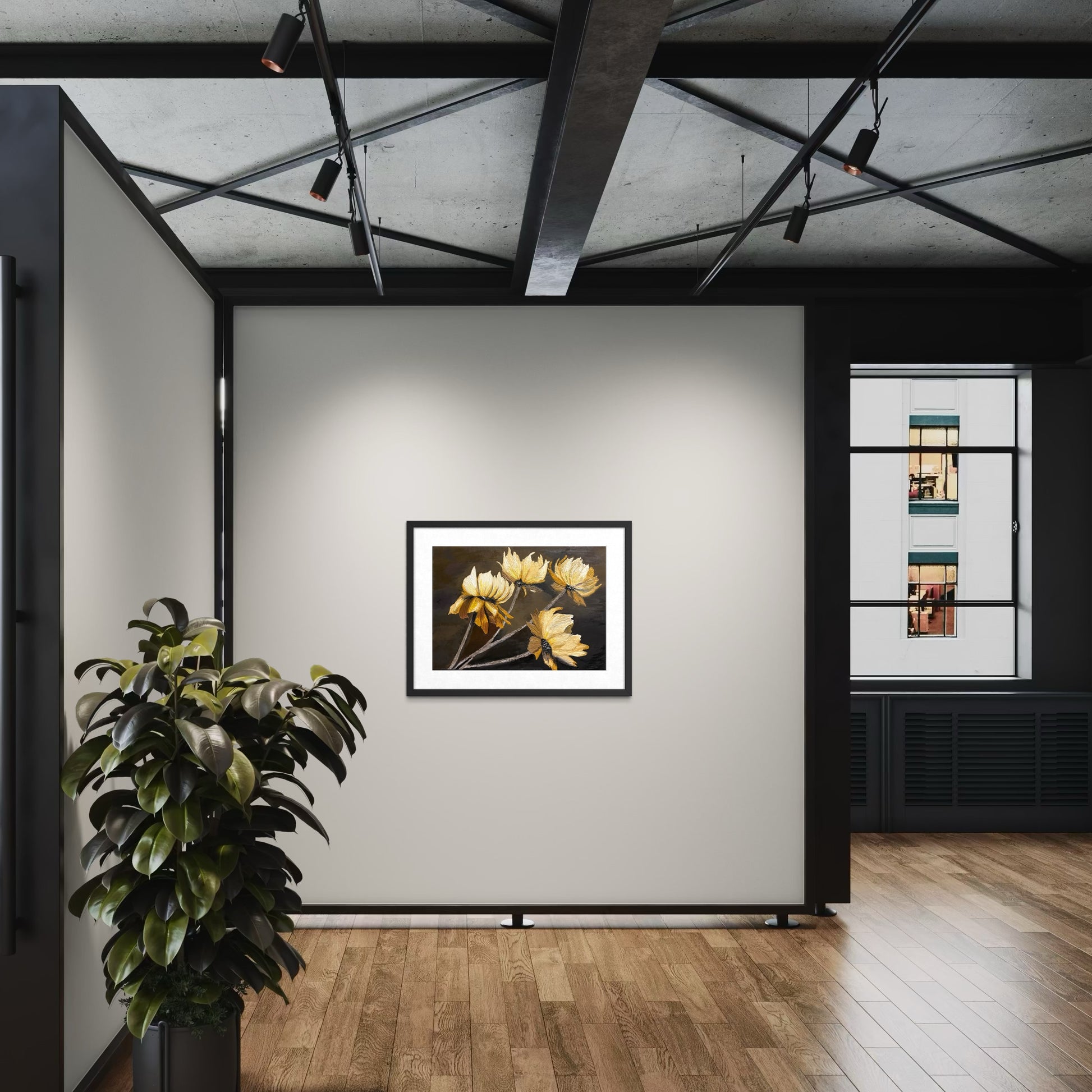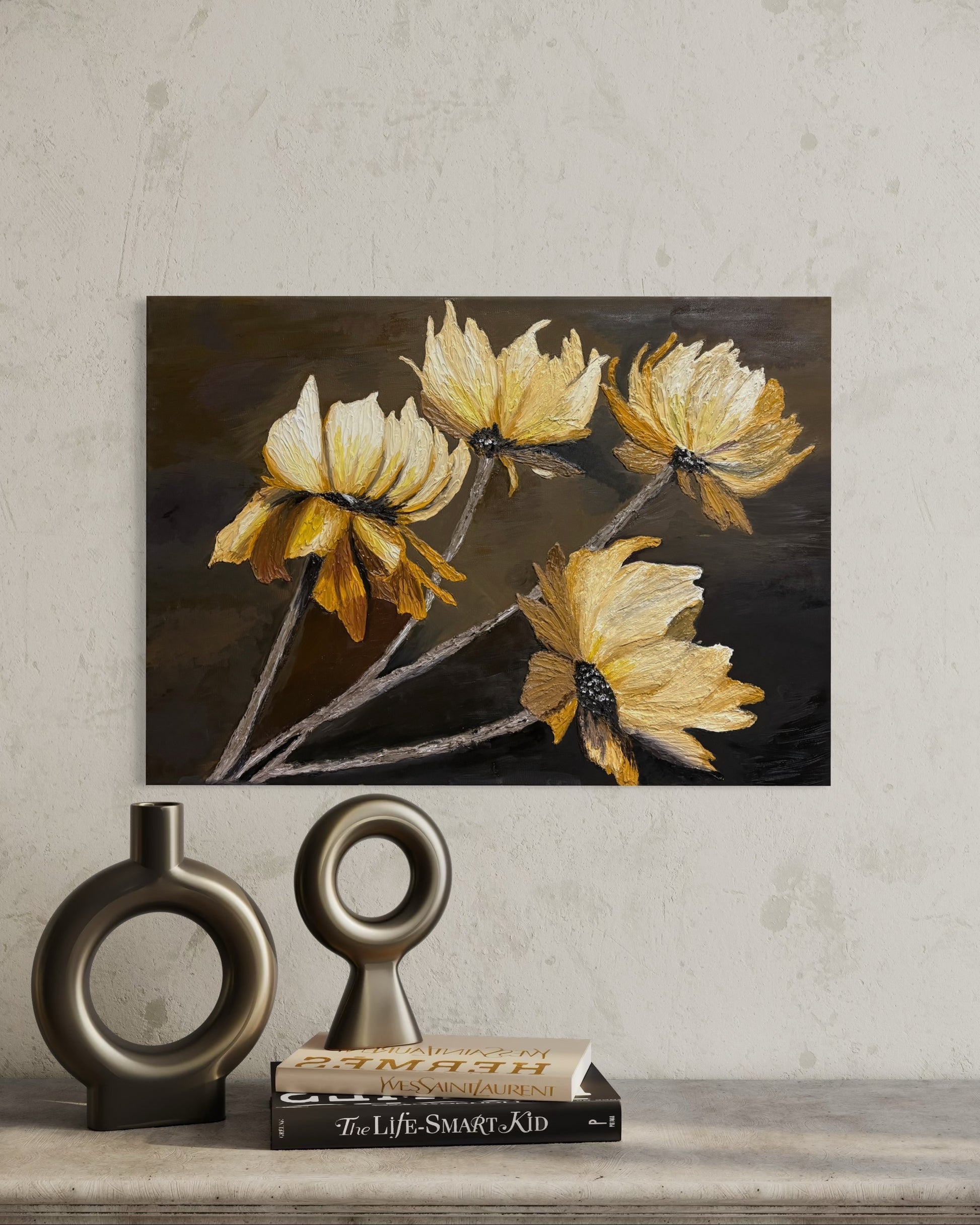 The golden petals symbolize quiet resilience, renewal, and gentle strength. Their sculptural form represents beauty that endures over time—warm, imperfect, and full of life. The raised texture brings a sense of presence, as if each flower carries its own breath and movement.